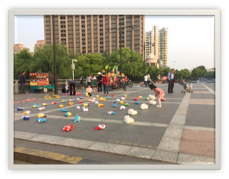 Vlakbij het hotel was een groot recreatiepark waar Shanghai in de vrije tijd kennelijk naartoe gaat. Ik kon er niet in, want ze waren aan het sluiten, dus ik weet niet zeker wat er in het park te beleven was, maar deze foto was net buiten het park, waar kleine kinderen nog even vermaakt konden worden. Er waren overigens aardig wat straatverkopers, vooral die groente en fruit verkochten, zonder enige infrastructuur van wat ik kon zien.