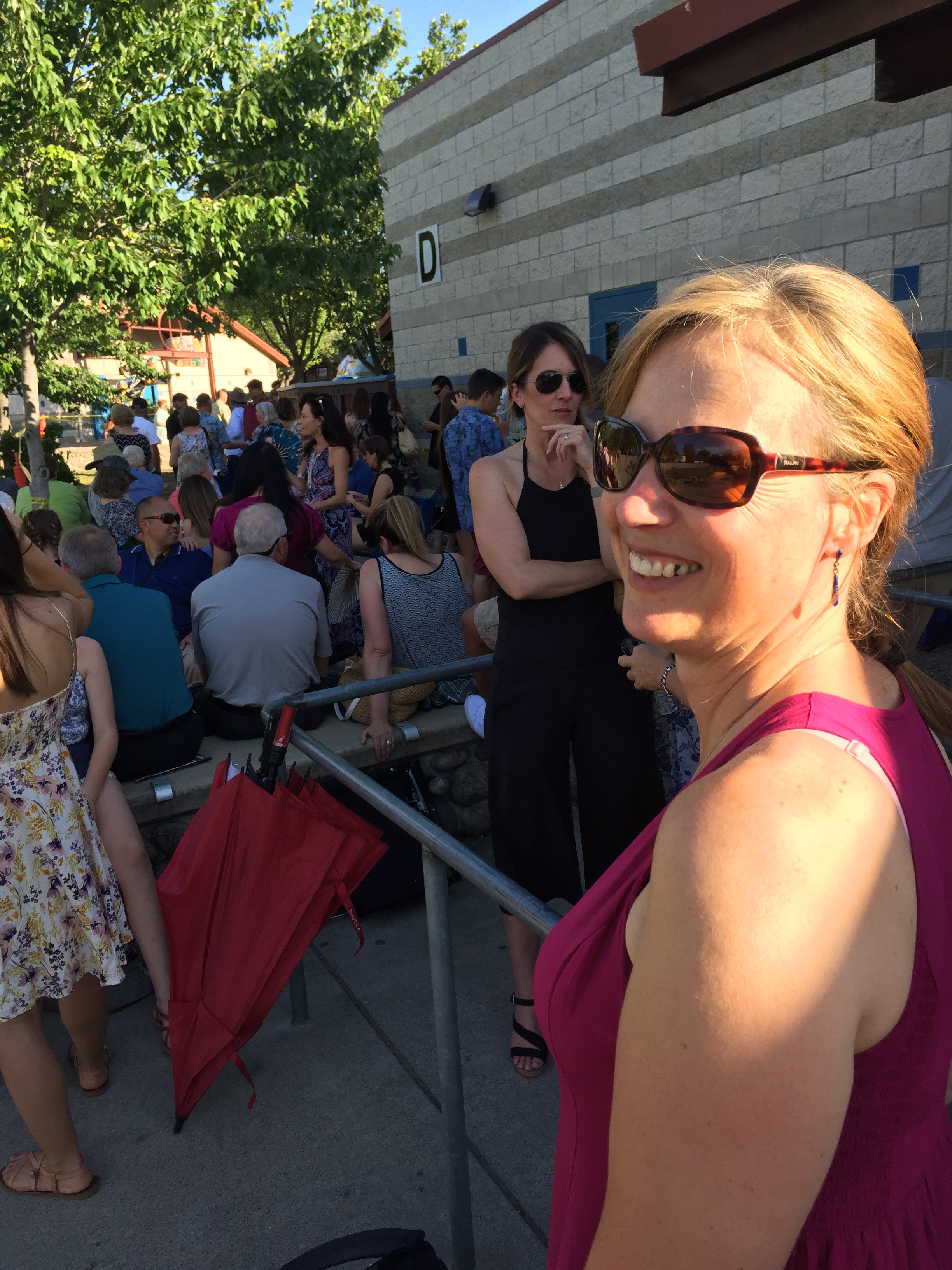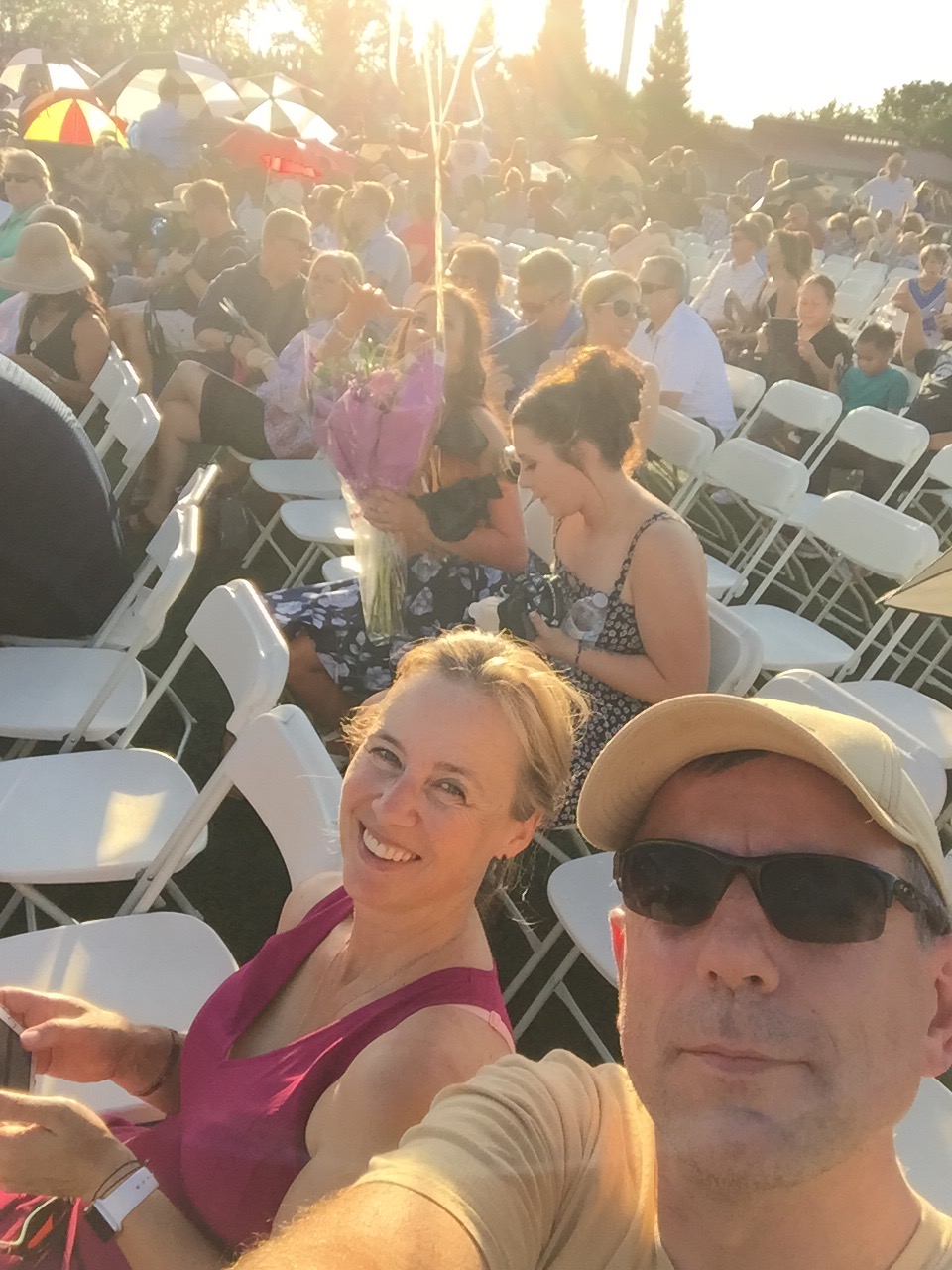 6:15pm. Margreet en ik staan in een lange rij te wachten tot we naar binnen mogen. Nog 1:15 tot het begint. 102°F in de schaduw.